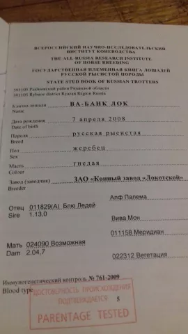 Продается русский рысак ( жеребец) Ва-Банк Лок , гнедой масти, 2008 г.р. Отец - Блю Ледей( Алф Палема - Вива Мон) Мать - Возможная( Меридиан - Вегетация). Бегал в качалке, но в последнее время содержался в качестве производителя, ездили по полям верхом но только рысью. Все вет-манипуляции спокойно и вовремя. Причина продажи: сокращение поголовья.