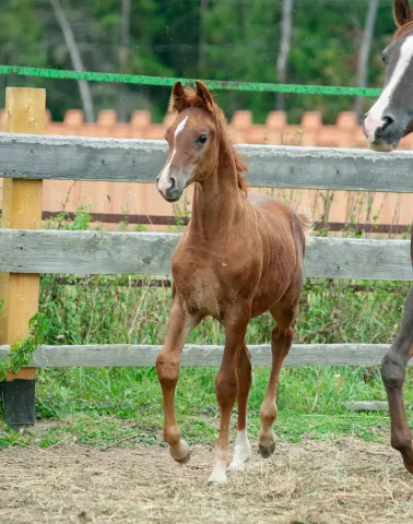 Крепкий, породный жеребчик, с очень красивой головой. Глубокий, широкий, костистый. Интересен для шоу, в пробеги, любительский и детский спорт.