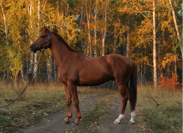 Красивый конь с хорошим телосложением, отлично держит массу, добрый и послушный.