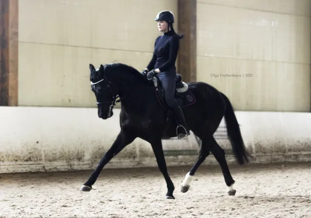 Прекрасная кобыла в любую дисциплину. Очень качественные аллюры с большим захватом пространства, галоп в горку, эффектная рысь, шаг с хорошим заступом. Недавно заезжена, на данный момент проходит базовую подготовку. Отлично делает вольты, перемены, переходы, остановки. Лёгко и быстро отвечает на средства управления, мягкая на рот. Сырая одиночная менка ноги на галопе, кавалетти, сырые уступки и плечо. Напрыгана в шпринте до 120 см. Прыжок резкий и техничный, аккуратная. Спокойная в полях. Ничего не боится, не шарахается, доброезжая и спокойная в быту. Подойдёт даже для начинающего под руководством опытного берейтоа и тренера. Здорова, расчищается, без денниковые пороков. Есть косметичнский дефект(небольшой пибгак на задней ноге, почти не заметен).