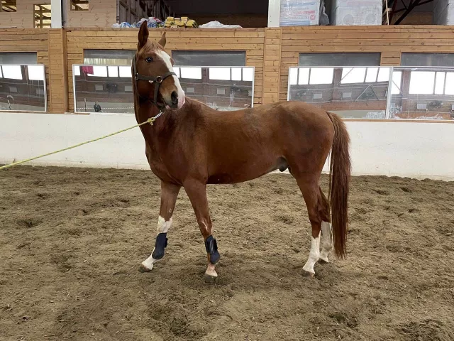 На продажу предлагается 4-х летний рыжий мерин буденновской породы. 163 см в холке, растёт.Нарядный, не агрессивный, Прошёл начальную стадию заездки (шаг рысь галоп). Напрыгивался в шпринте. Находится в постоянном тренинге.