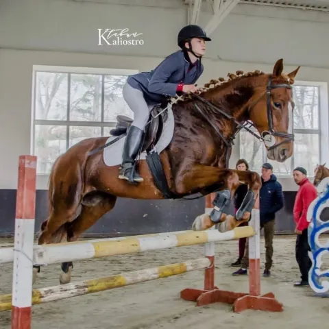 Жеребец.Буденновской породы Рыжей масти.160 см в холке. 2017 года рождения. В работе очень внимательный, не отвлекается.Прыгает до 115 см, в шпринте до 130 см. Знает пируэты на шагу, уступки, плечи, контргалоп, легко меняет ноги на галопе.Выезжает в поля, не растаскивает, ничего не боится, прыгает ветки, поваленые деревья.Все манипуляции без проблем.Не имеет денниковых пороков.Находится в Нальчике.