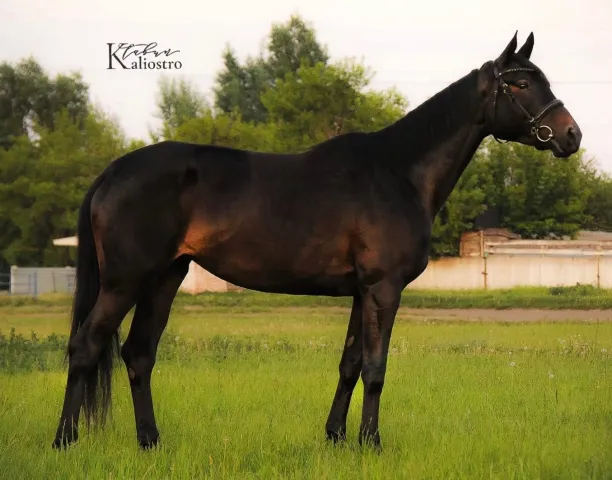 Кобыла.Тракененской породы.Караковой масти.170 см в холке. 2018 года рождения.Линия Burnus AA, Семейство 165 Омеги 285.Очень ласковая, легко стабунивается, стоит идеально с любой лошадью, быстро учится новому.Все манипуляции без проблем.Поздней заездки.Имеет три правильных аллюра, мягкая и удобная под седлом, лёгкая на шенкель.Прыгает до 100 см. Подойдет под амбициозного всадника.Абсолютно здорова, не имеет денниковых пороков.Находится в Красноярске.