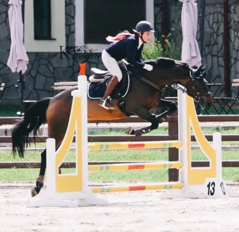 Мерин.Полукровной породы.Гнедой масти.158 см в холке.2012 года рождения.Стартовый опыт до 120 см, дома до 130 см, знает менки, плечи, уступку, принимание, идёт в поводу и работает от шенкеля.Активный, подвижный, спокойный, ориентирован на человека.Подойдёт под начинающего и любителя.Имеется паспорт ФСКР.Абсолютно здоров.Находится в Московской области, КСК «Пегас».