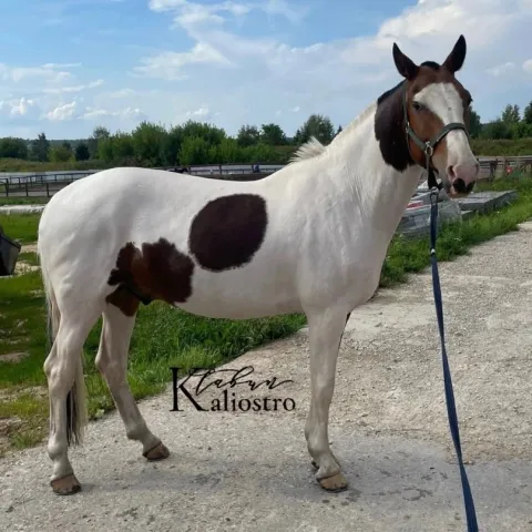 Мерин.Помесь.Гнедо - пегой масти.156 см в холке, растет.2019 года рождения.Спокойный, добрый, отзывчивый.Знает 3 аллюра, начал напрыгиваться, хорошо себя ведет в полях.Подойдет под любого всадника.Имеется паспорт ВНИИК.Здоров.Находится в Московской области.
