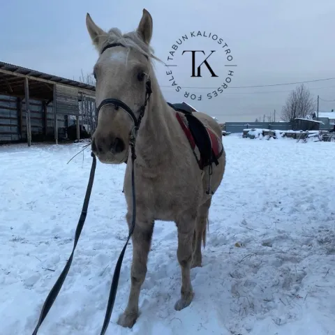 Кобыла.Помесь. Соловой масти.155 см в холке.2021 года рождения.Отец - Владимирской породы, мать - Башкирской породы.Спокойная, очень добрая.Знает корду, седло, уздечку.Садились, ходили шагом.Подойдет под ребенка.Здорова.Имеется договор купли - продажи, вет.справка.Находится в Пермском крае.