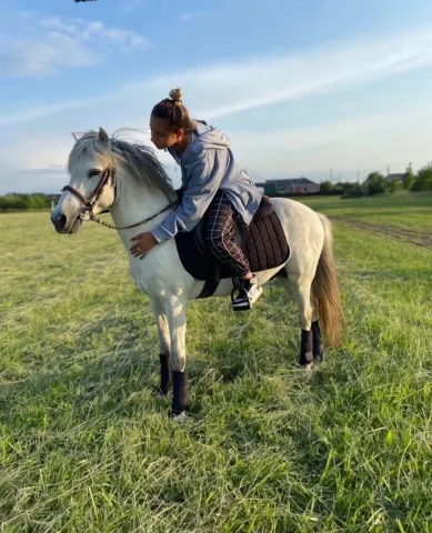 Работает под детьми и подростками, знаком с упряжью, отлично ведет себя в полях.