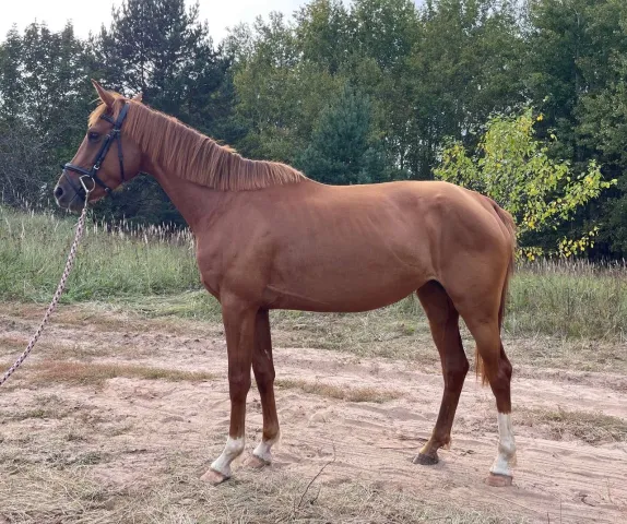 НА ПРОДАЖУ №4466:Кобыла 2021 г.р.Рост 160 см.Донской породы, без племенных документов. Недавно заезжена, не форсирована, под верхом три аллюра, ходит в лес и поля. Пробовали прыгать в шпринте до 100 см, под верхом крестики, идет уверенно. Обладает просторными движениям и техничным прыжком. Не снимает и не высаживает, подойдет под любого ездящего всадника. Добрая и ласковая, ориентирована на человека. В руках осторожная, под верхом чувствует себя гораздо увереннее, к внешним раздражителям спокойна.Возможно жеребая на 2025 год от буденновского жеребца. Не имеет проблем по здоровью и денниковых пороков, готова на любые проверки за счет интересующейся стороны. 450 тысяч рублей. Находится в Нижегородской области, поможем с поиском доставки в любые регионы.
