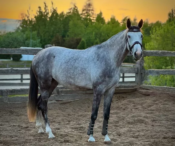 В родословной St.Moritz, Sandro Hit, Баббит, Зорро. Маршруты 90см на соревнованиях. Прошла выездковую подготовку и выезжала на новогодние старты. Кобыла будет интересна в любую дисциплину. Верхом послушная и старательная, не боязливая. Напрыгивается на свободе, отличная техника прыжка. Золотая лошадь по голове. Пробовали подсадить ребенка, катала как хрустальную вазу. Обладает удобным галопом, управляется на пальчиках. Ходит в поля/леса. Гуляет в табуне, так и одна. Бытовые манипуляции без проблем. Здорова!