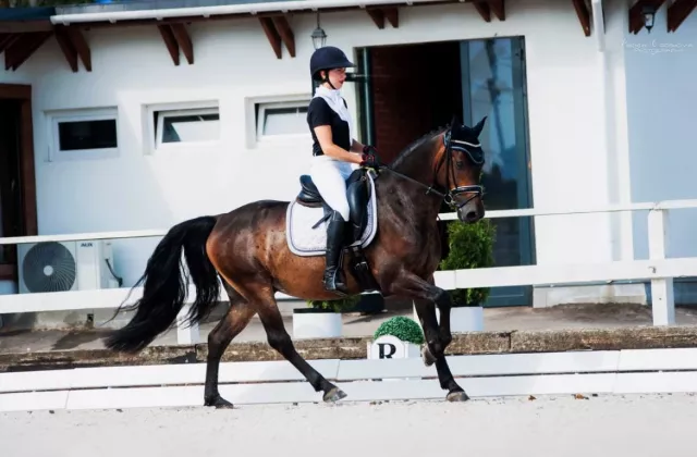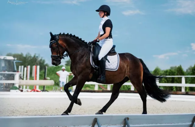 * Имеет стартовый опыт в выездке - тест для начинающих всадников, езда ППД. В конкуре - маршруты 80см. Дома прыгает до метра, упражнения до 105. знает уступку, плечо, прибавки.