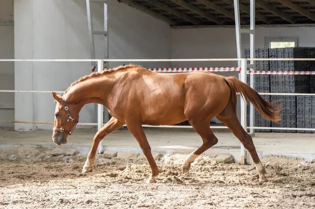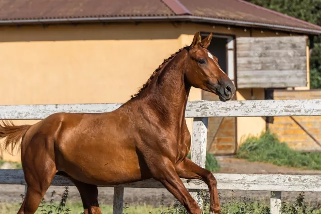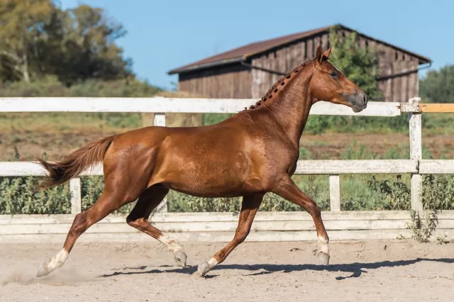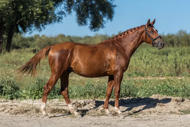 Заезжен весной 2025 г. Проходит базовую подготовку под седлом. В шпрингартене напрыган до 140 см. Работается согласно возрасту, не форсируем. Хороший шаг (в испытаниях за шаг 9!! баллов из 10), эффектная рысь с тенденцией в горку, хороший круглый галоп. Социализирован, живет в леваде со сверстниками. Есть вет.чек.