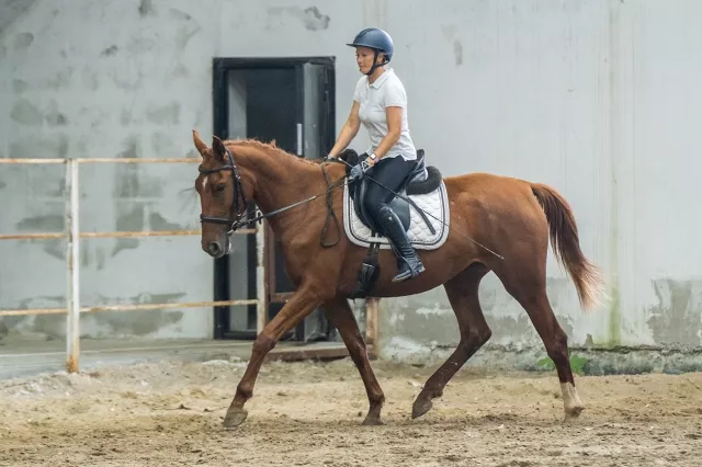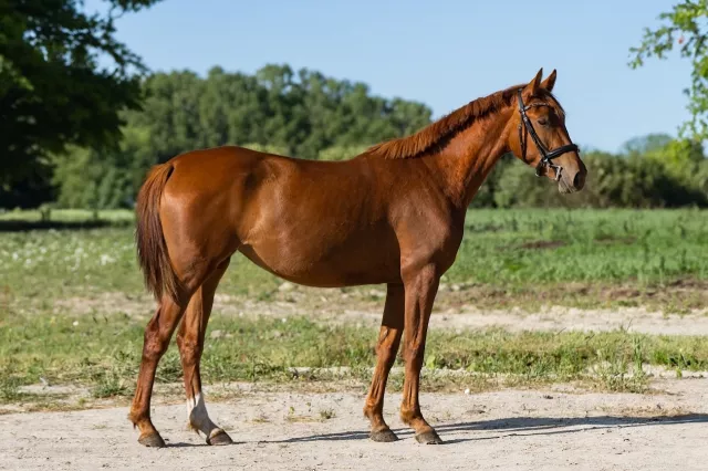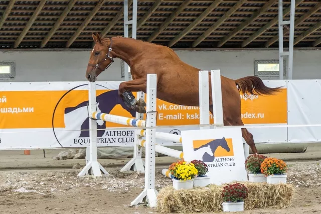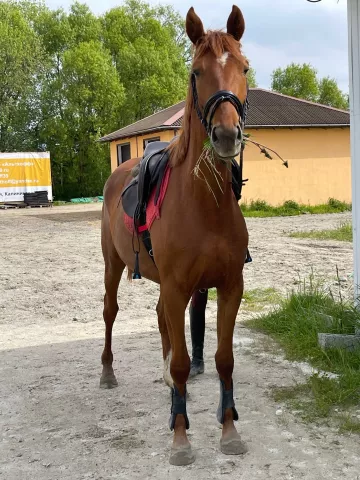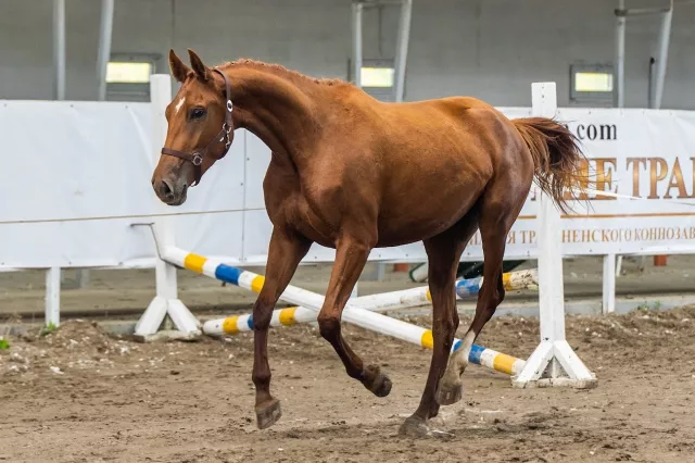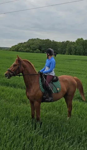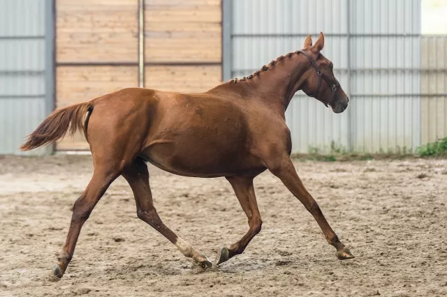 Трехлетняя тракененская кобыла. Заезжена в феврале 2025 года. Сейчас под седлом проходит базовую подготовку. На заводских испытаниях получила оценку прыжковых качеств в шпрингартене 9 баллов из 10 возможных (130 см). Под седлом напрыгана до 90 см. Регулярно выезжаем на ней в поля. Уже сейчас с легкостью бежит езду для лошадей 4-х лет. Ласковая, легко обучаемая, в быту супер комфортная. Социализирована, живет в табуне. Проблем по здоровью не наблюдалось.