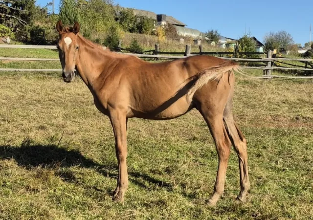 Чистопородный тракененский жеребец рыжей масти. Правильного экстерьера, ровные ноги с хорошими сухожилиями. Жеребенок оповожен, расщищается. Ожидаемый рост 165-167 см. Получает витамины, летом на пастбище.