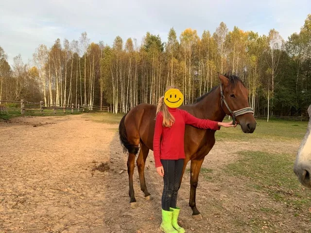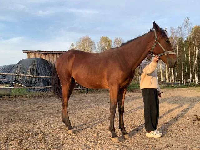 Проблем по здоровью нет. Оповожен. Без вредных привычек. Круглосуточный выпас. Ориентирован на человека. Занимается в руках, поставлен на корду. Все манипуляции без проблем. Мать чистая Карачаевка 159вх. Отец неизвестен. Рядом с лошадью стоит девушка, рост 172.Возможен обмен на:сено,зерно,коров,быков.