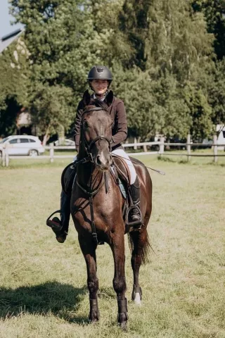 Работает в конкурном направлении, выступает по маршрутам 100, дома маршруты 110, одиночные 130. Конь активный, живой, подойдет под ездящего ребенка, любителя. Неконфликтный с другими лошадьми, гуляет как один, так и в компании. Все бытовые манипуляции знает.