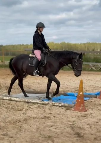 Заезжен, очень мягкий и удобный под седлом. Можно делать зарядку, на корде заниматься вольтмжировкой, скакать по кругу галопом с брошенным поводом. На лошади ездит ребенок!
