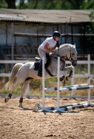 Маршруты до 100 см, одиночные до 120 см. Есть стартовый опыт, часто в призах, на выездных соревнованиях - как дома. Подойдет под любого ездящего всадника. Адекватный по голове, не пугливый. Уверенно идет на барьер, не обносит, не закидывается, на высоту не смотрит. Спокойный и добрый. Работает с другими лошадьми на одной площадке.