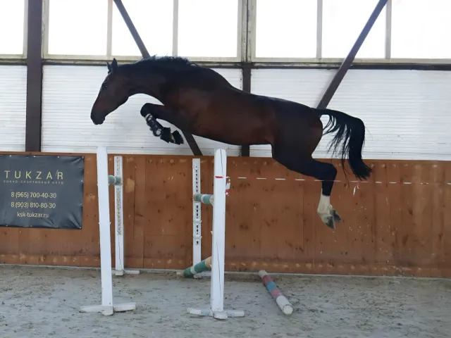 Под верхом только начинает прыгать, смело идёт на барьер.