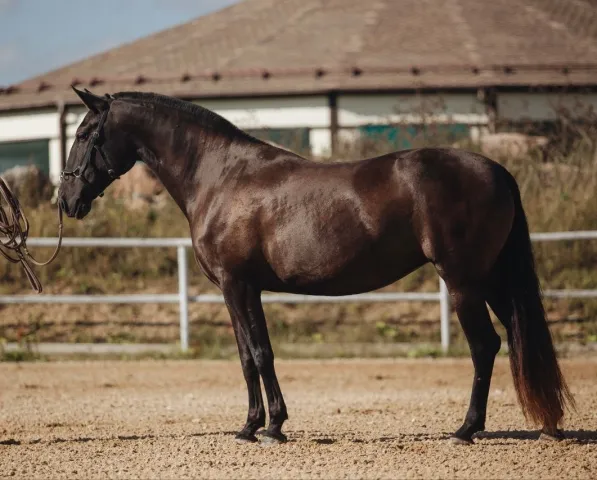 Великолепная вороная кобыла, крупная и широкая, барочного типа. Базово заезжена в 5 лет. Жеребилась, сейчас стоит с жеребенком, отъем в декабре 2025. После отъема жеребенка будет втягиваться в верховой тренинг. Хороший характер.