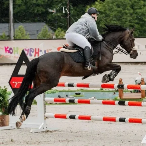 Кобыла. Немецкой спортивной породы. Тёмно - гнедой масти. 168 см в холке. 2015 года рождения. Очень ласковая, безумно любит общение с человеком, никогда не обидит. Стартовый опыт до 130 см. Прощает все ошибки, ни на что не обижается, всегда помогает всаднику.Находится в Московской области.