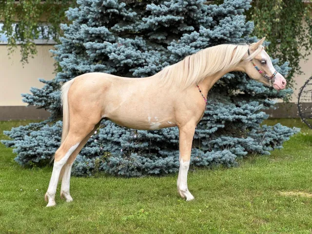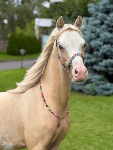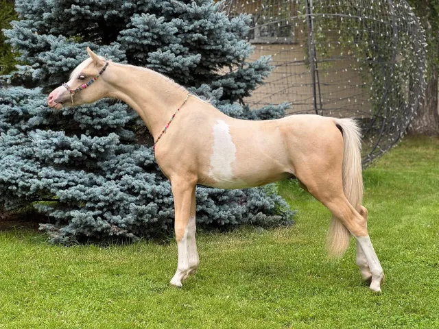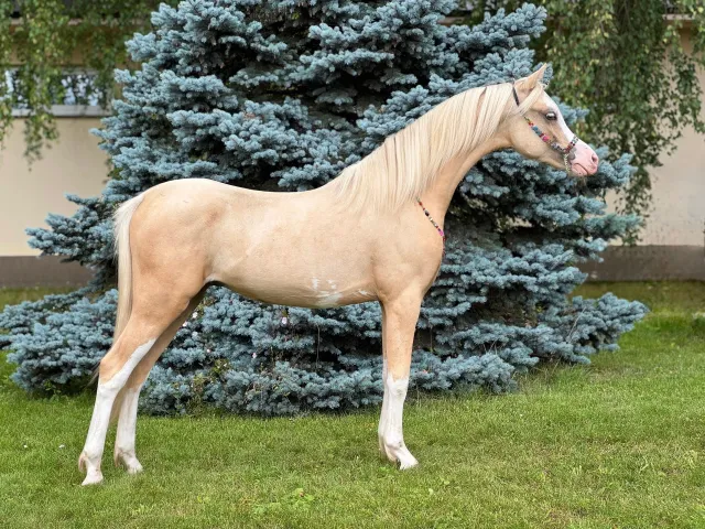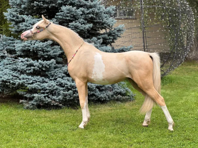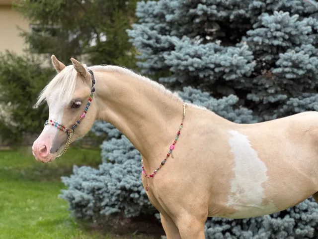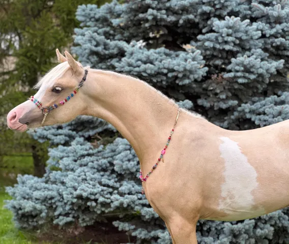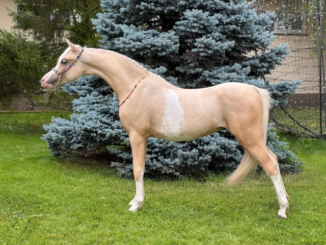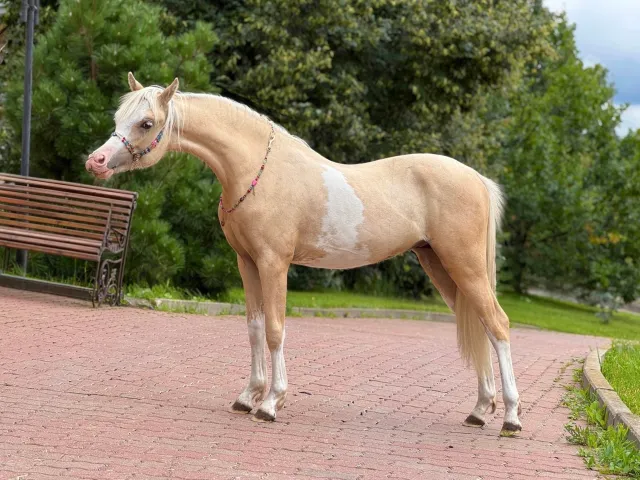 Очень нарядный эффектный экстерьеристый, с шикарным выходом шеи, аккуратной мордочкой, весь ладненький сказочный красотун. С высокими четырьмя носочками, проточиной и пежиной на пузике, голубым глазиком. Контактный, смышлёный любознательный, приятный в общении, добронравный, смелый не пугливый, без вредных привычек, знает все манипуляции. Моционится на корде, делает переходики на голос. Знает несколько команд и трюков, делает на свободе - испанский шаг, толкает мячик, принимания уступки осаживания, вертись кругом, остановки на голос на расстоянии пр.