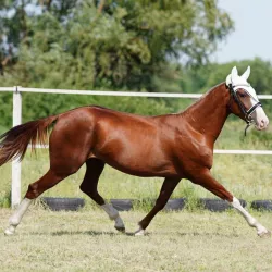 Очень изящная, высокая и красивая кобыла. Привезена в Россию в 2023 году и на сегодняшний день выступает в соревнованиях по конкуру с высотой до 140 см. Династия очень аккуратная и смелая лошадь с прекрасной…