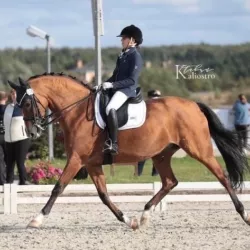 Очень изящная, высокая и красивая кобыла. Привезена в Россию в 2023 году и на сегодняшний день выступает в соревнованиях по конкуру с высотой до 140 см. Династия очень аккуратная и смелая лошадь с прекрасной…