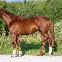 Четырехлетний тракененский жеребец. Комфортный в быту и под седлом. До трех лет рос со сверстниками в леваде, социализирован. Напрыган в шпрингартене до 140 см. На заводских испытаниях в трехлетнем возрасте…