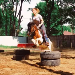 Выступал в детской выездке и в конкурсах до 100 сантиметров. Необыкновенно ласковый и добронравный. Здоров. Тренер Варнавская Елена мсмк. Оригинальная яркая масть (во лбу звезда, смещенная вправо, по…