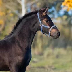 №1086 — Кобыла, 2025 г.р., 165 см в/х, пегой масти 🍁 Дочь известного жеребца Siran von Moorlage. Получает полные документы ZSSE. На бонитировке жеребят получила общую оценку 8,7 баллов. 🍁 Хлоя обладает…