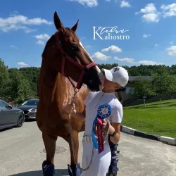 Очень изящная, высокая и красивая кобыла. Привезена в Россию в 2023 году и на сегодняшний день выступает в соревнованиях по конкуру с высотой до 140 см. Династия очень аккуратная и смелая лошадь с прекрасной…
