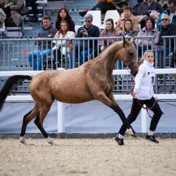 Кобыла. Ахалтекинской породы. 163 см в холке. 2021 года рождения. Отец Варгуш Шаэль, Мать Адира. Крупная, гармоничная и добронравная с выраженным породным типом. Заняла 2 место на ВДНХ в ринге годовиков…