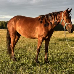 Мерин 2016гр. Полукровной породы.Рост 165см в холке. Стартовый опыт в маршрутах до 120см включительно. Одиночки до 135см поднимали, маршруты и связки до 125 130см.Всегда старается помочь на маршруте,…