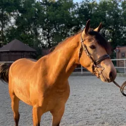 Очень изящная, высокая и красивая кобыла. Привезена в Россию в 2023 году и на сегодняшний день выступает в соревнованиях по конкуру с высотой до 140 см. Династия очень аккуратная и смелая лошадь с прекрасной…