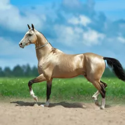 Ахалтекинская изабелловая лошадь. 2014 года рождения. Рост в холке 165 см. Темперамент уравновешенный. Очень красивая и ухоженная.