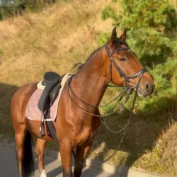 Мерин.Ганноверской породы.Гнедой масти.167 см в холке.2005 года рождения.В одних руках с 7 лет.Спокоен в полях.В руках не бьет, не кусается.Знает боковые элементы, осаживание, сбор, стартовал по детским…