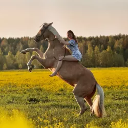Кобыла выращена в одних руках. Напрыгана до 80 см (выше не ставили, нет спортивного грунта). Заезжалась в упряж, но давно уже не работала. Может работать без железа. Умеет делать свечку, трапецию,…