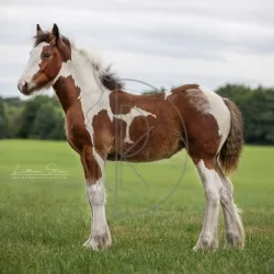 №1086 — Кобыла, 2025 г.р., 165 см в/х, пегой масти 🍁 Дочь известного жеребца Siran von Moorlage. Получает полные документы ZSSE. На бонитировке жеребят получила общую оценку 8,7 баллов. 🍁 Хлоя обладает…