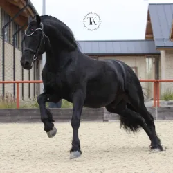 Жеребец. Фризской породы. Вороной масти. 162 см в холке. 2020 года рождения.Уровень подготовки: езды для 4 летних лошадей. Подойдет под юношу, опытного ребенка или любителя с берейтором. Работается в…