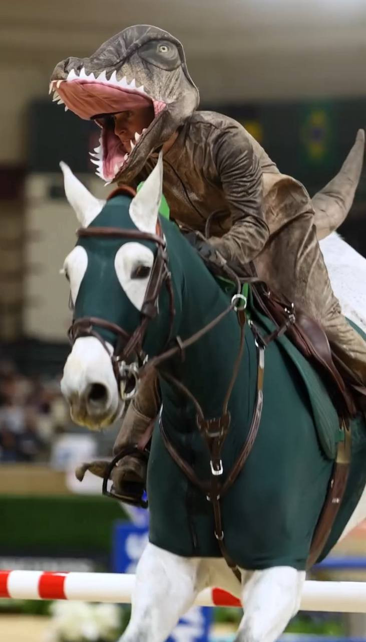 Одно время популярность набирали костюмы воздушные костюмы в виде тирекса. В похожем маршрут отпрыгала американка Кейтлин Кэмпбелл. Конкуристка также сделала «костюм» и для своей лошади. Выглядит достаточно оригинально и свежо, а также точно понравится публике.