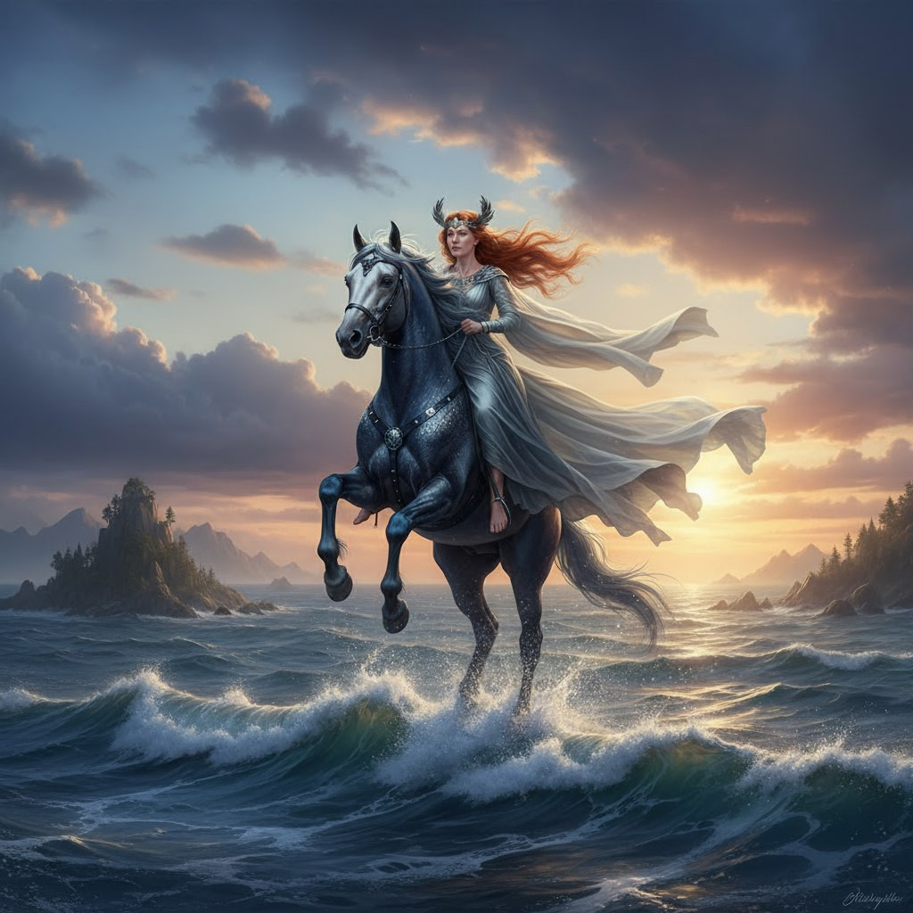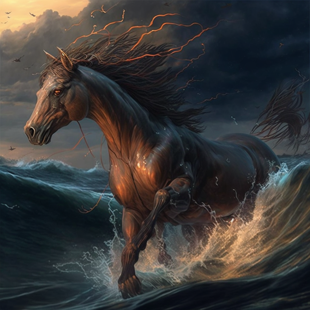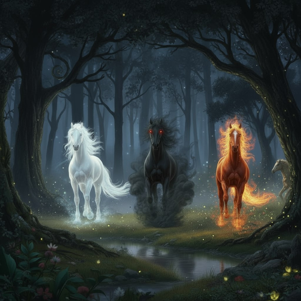 Кельтские и британские легенды поведают нам об Эпоне – богини лошадей, покровительнице всадников и плодородия. Ее образ соединял животворящую силу земли и способность вести путников сквозь неведомые пространства. О Кельпи — водяном духе в облике черной лошади, утягивающей людей в глубины. В нем воплотилась опасная притягательность водной стихии, способной манить и губить. И о Побба — ирландском оборотне в виде темной лошади с огненными глазами. Его двойственная природа напоминала о том, что даже знакомый облик может скрывать иную сущность.