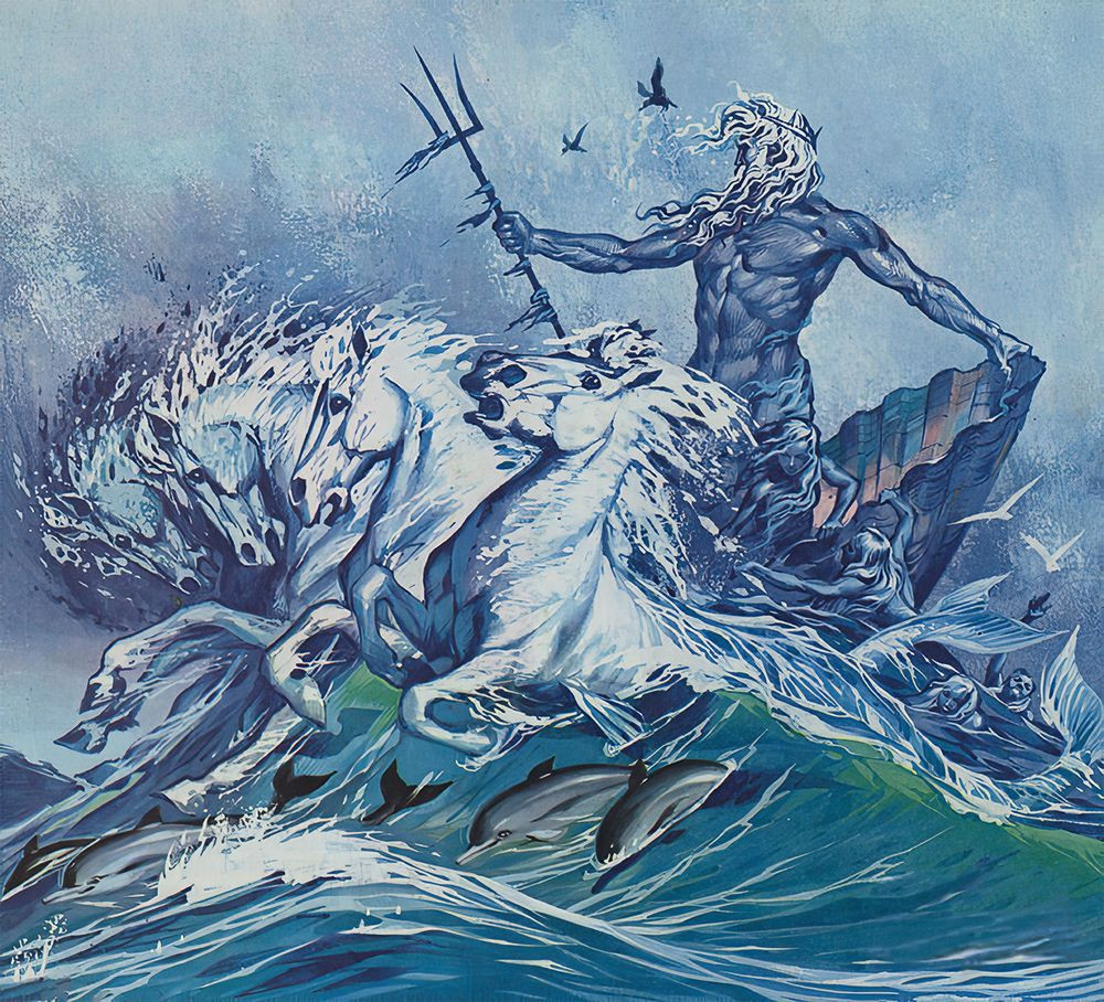 Лошади Посейдона запряжены в колесницу бога моря. Морские гиппокампы (наполовину лошади, наполовину рыбы) воплощали двойственную природу — способность покорять и сушу, и водную стихию.