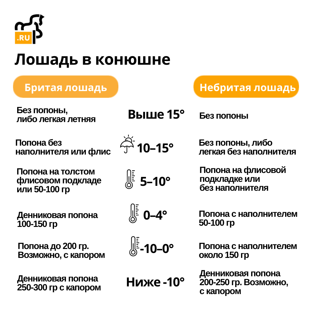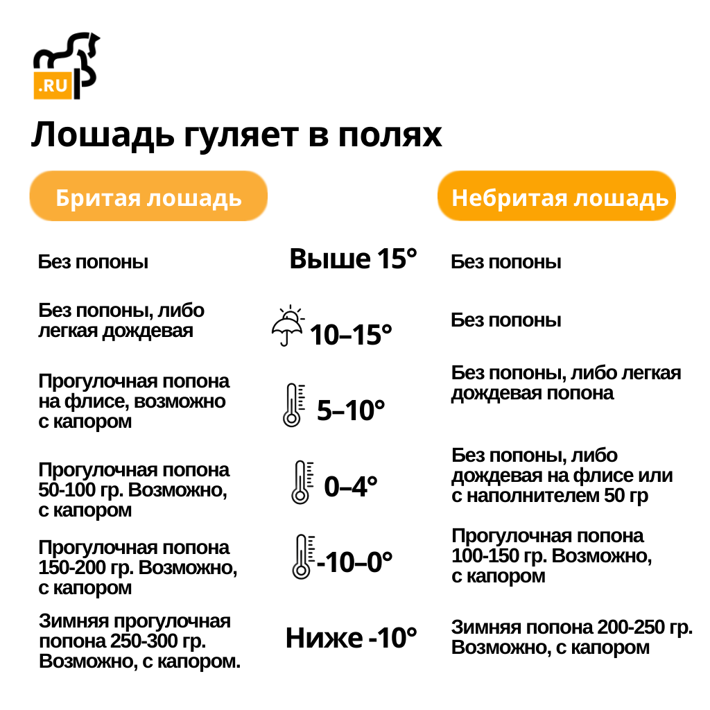 Конечно, многое зависит и от того, где лошадь преимущественно проводит время — в конюшне или в поле. Наша редакция подготовила для вас полезную инфографику, которую можно сохранить, чтобы не прогадать с выбором попоны.