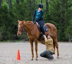 Бруно показывает всаднице, какое усилие нужно прикладывать, работая шенкелем. Мягкий нажим может влиять на ритмичность движений, если уметь верно его использовать.