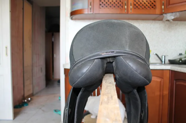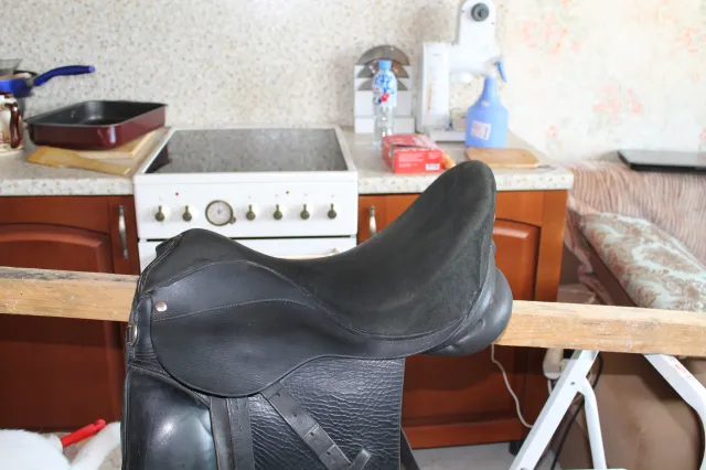 Продам седло выездка немного б/у. Есть небольшая потертость под крылом, без дефектов. Приструги и ленчик целые.