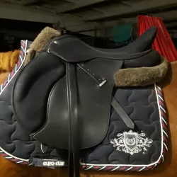 Конкурное седло в сборе , отлично сажает , очень мало ходило на лошади, по всаднику 17,5 на соединю спину и холку.