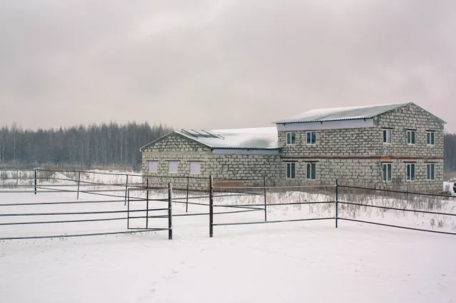 Светлая блочная конюшня 380 кв.м. на 16 денников 3х3 + 2 денника 3х6, делится на два отделения, проходы шириной три метра, просторный холл.