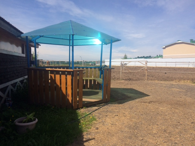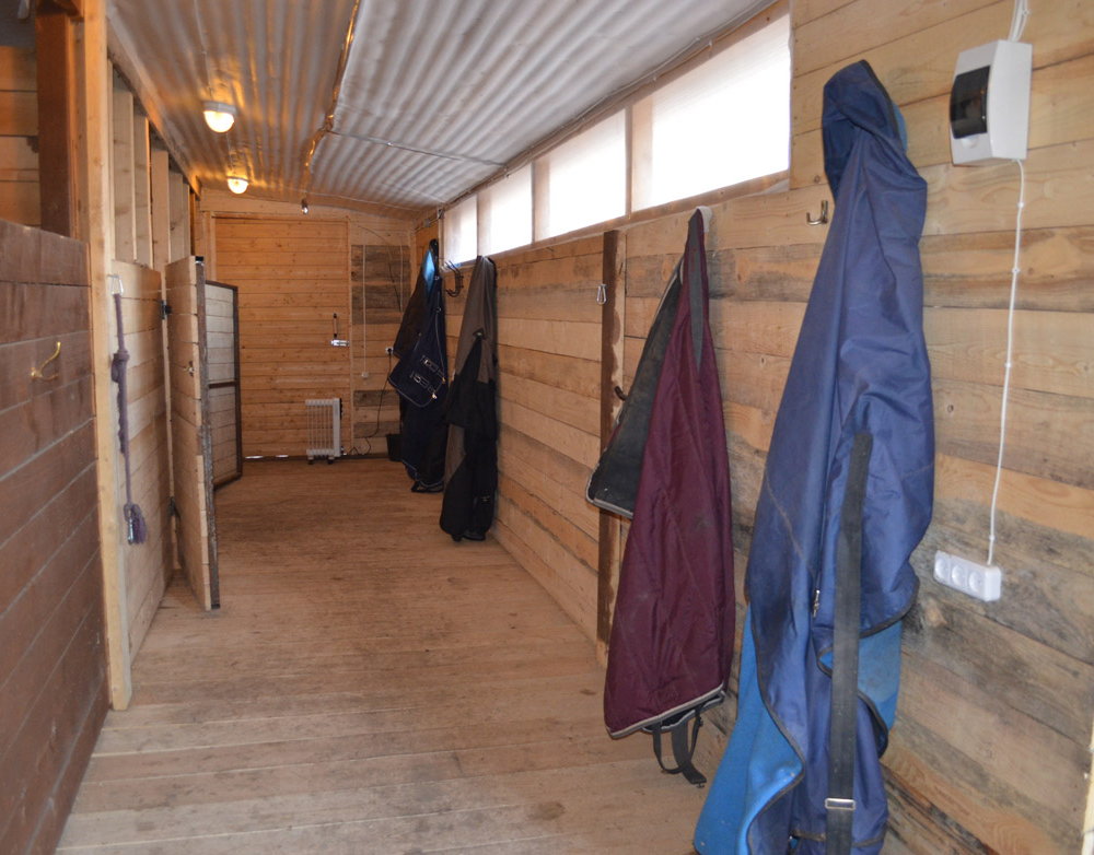 Конюшни деревянные, пол деревянный, денники 3х3, в конюшнях есть вытяжки и открывающиеся окна в денниках, мойка на уличной развязке, амуничники, теплый дом для переодевания и чаепития, туалет.