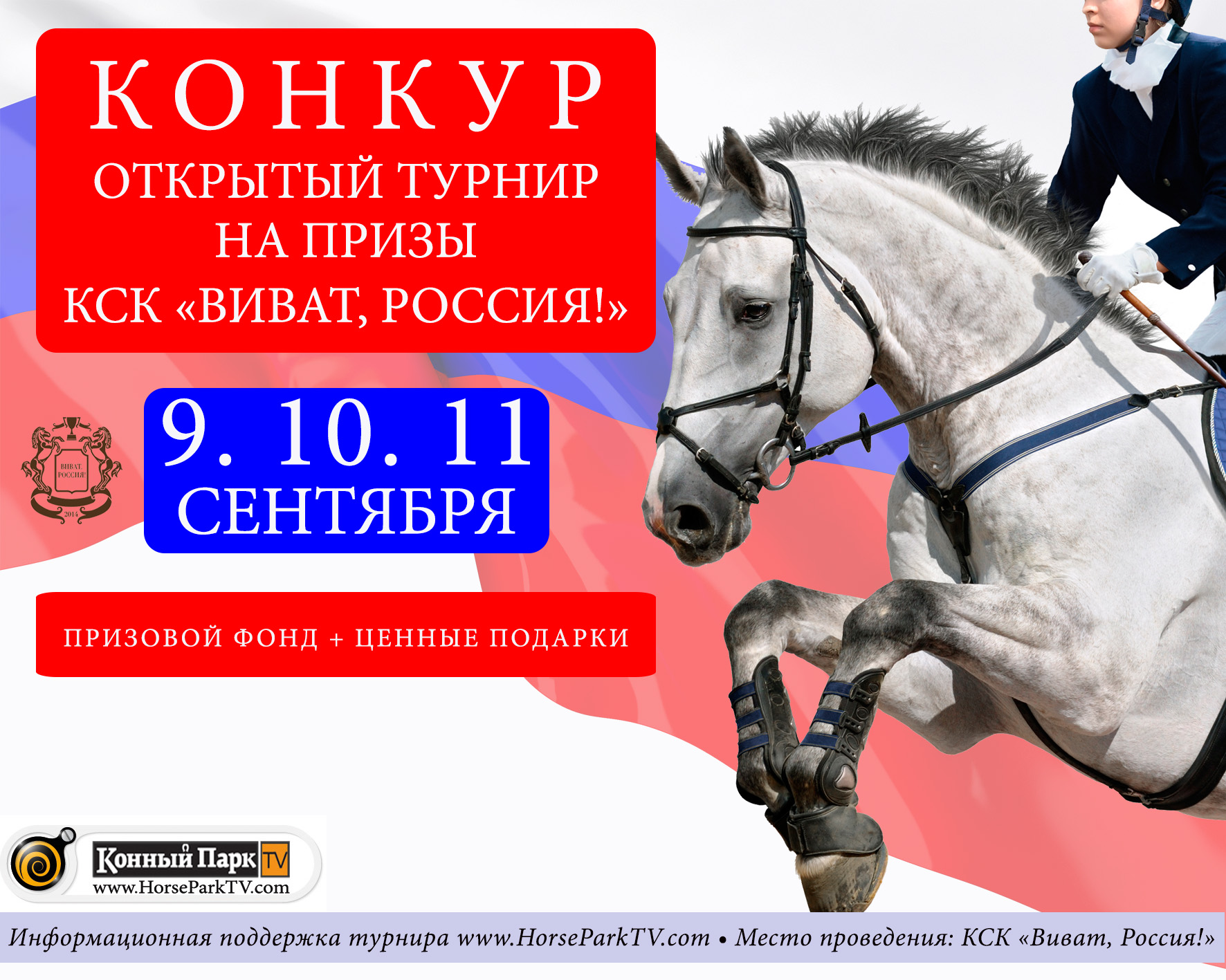 Приглашаем вас принять участие в соревнованиях для всадников на лошадях и пони «Открытый турнир по конкуру на призы КСК «Виват, Россия!», 09-11 сентября в КСК «Виват, Россия!» (Московская обл.)