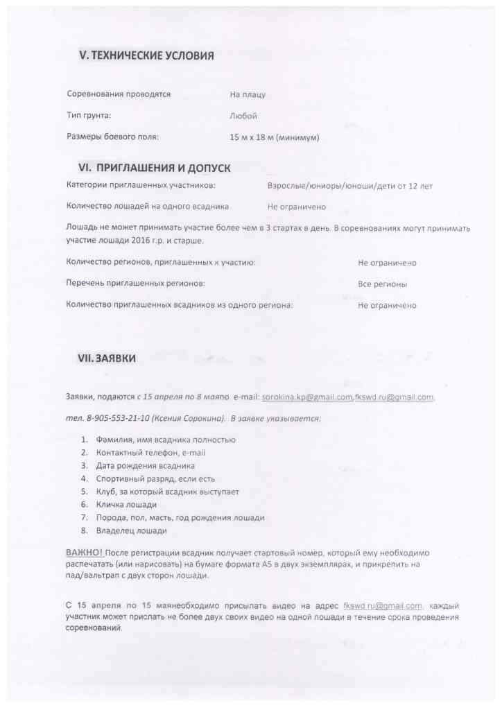 С 15 апреля по 15 мая можно присылать свои видео, каждый участник может прислать не более двух своих видео на одной лошади в течение срока проведения соревнований. Адрес для видео fkswd.ru@gmail.com, если видео большое, выкладывайте на общедоступные файлообменники и присылайте ссылку.
